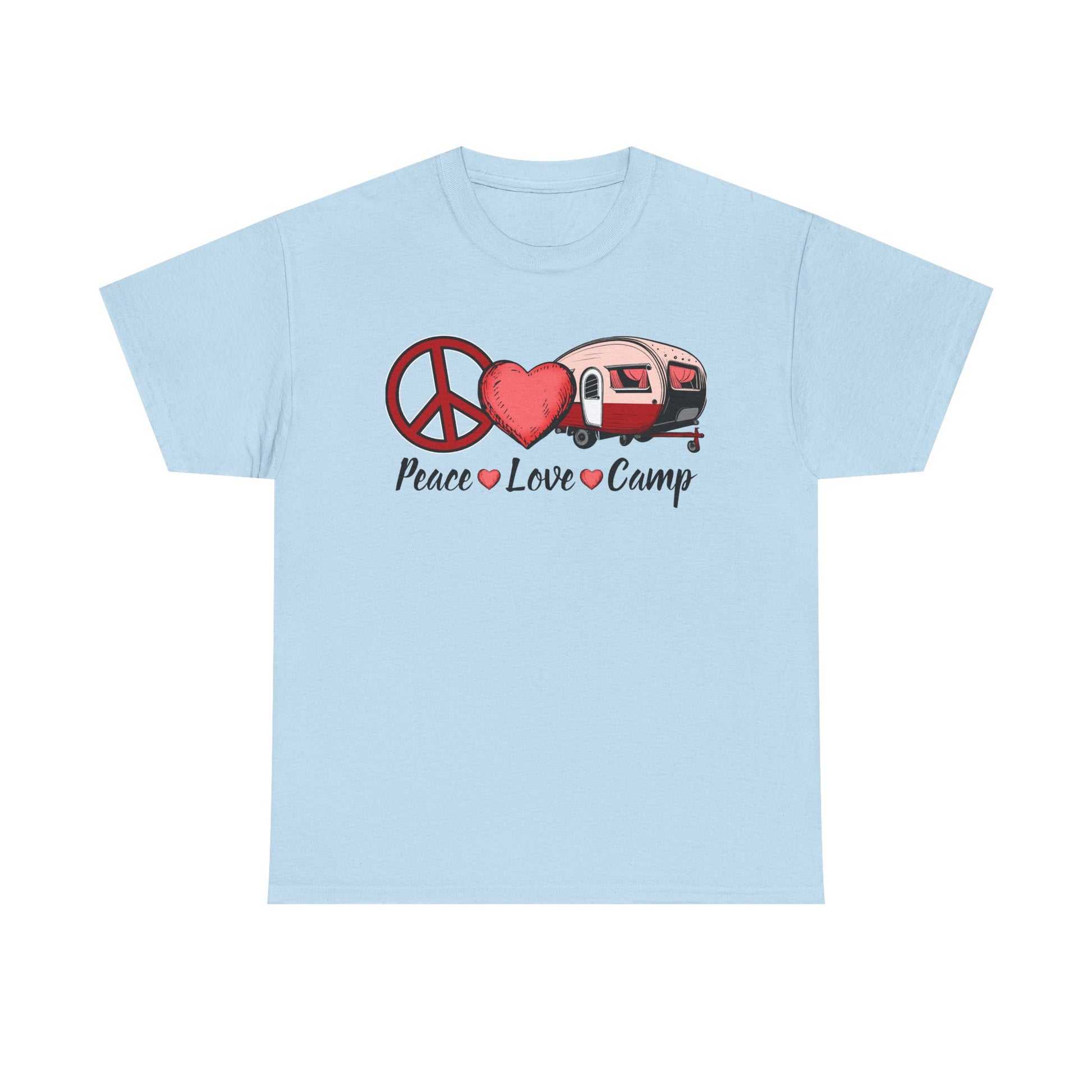 Peace, Love, Camp - The unisex heavy cotton tee is the basic staple of any wardrobe. It is the foundation upon which casual fashion grows. All it needs is a personalized design to elevate things to profitability. The specially spun fibers provide a smooth surface for premium printing vividity and sharpness. No side seams mean there are no itchy interruptions under the arms. The shoulders have tape for improved durability.